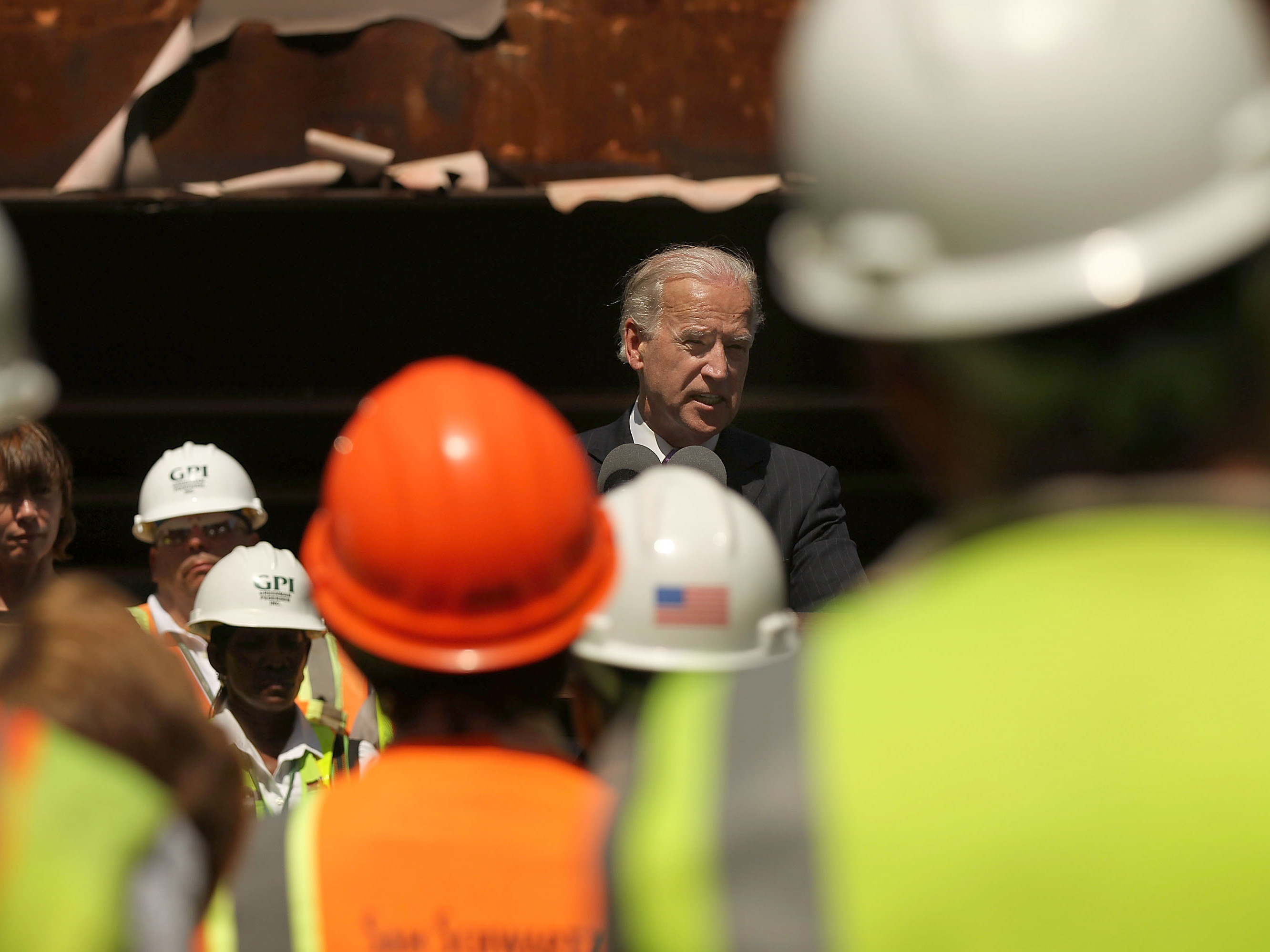 In 2010, Vice President Joe Biden speaks to construction workers at the Brooklyn Bridge, marking a renovation project which was partly funded by money from the 2009 Recovery Act. // Getty Images, Spencer Platt